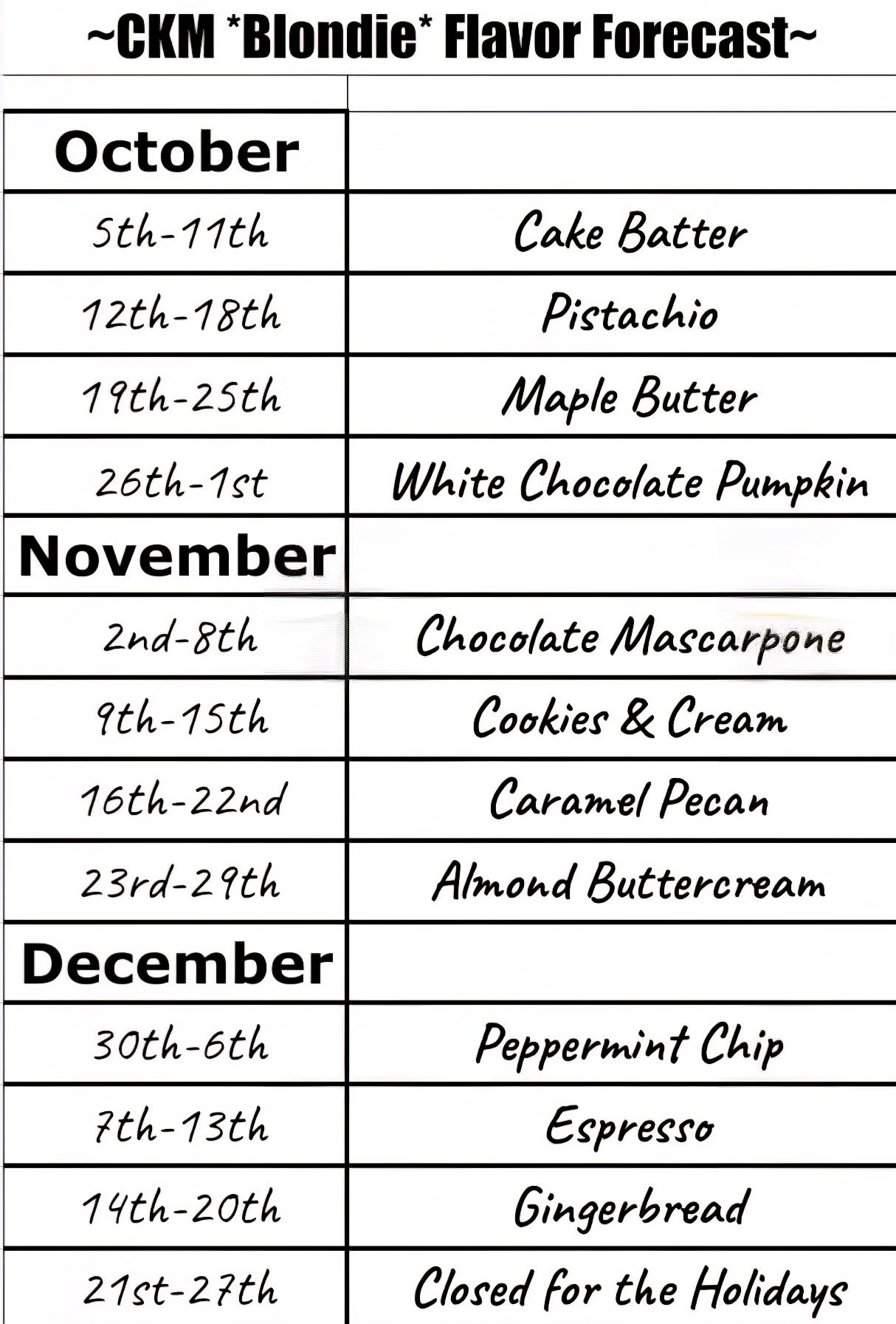 We’ll be doing a different flavor every week! Look at the Flavor Forecast menu to see what this week’s flavor is. Don’t forget they’re freezer friendly, so if it’s one of your favorites, stock up!